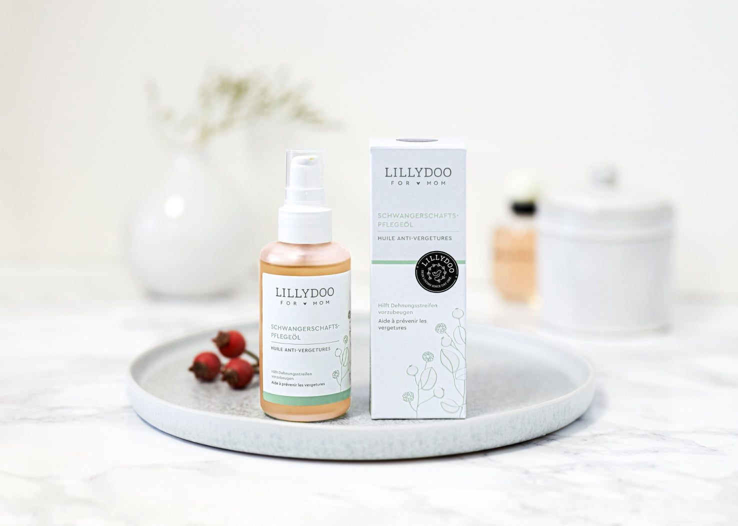 Unser Schwangerschaftspflegeöl nährt und pflegt die Haut werdender Mamas. Hochwertiges Hagebuttenöl beschleunigt die Regeneration der Haut, fördert ihre Elastizität und schützt sie vor dem Austrocknen. In Kombination mit wertvollem Algenextrakt vereint unser Schwangerschaftspflegeöl so die besten Eigenschaften zur Pflege der Haut in der Schwangerschaft und hilft, Dehnungsstreifen vorzubeugen.